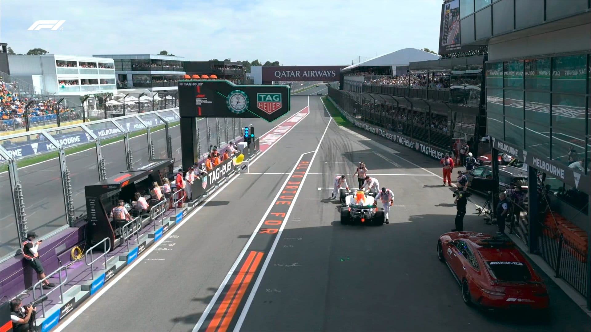 - Russel no puede salir desde el inicio ya que lo llevan de nuevo al garage para reparar la pieza