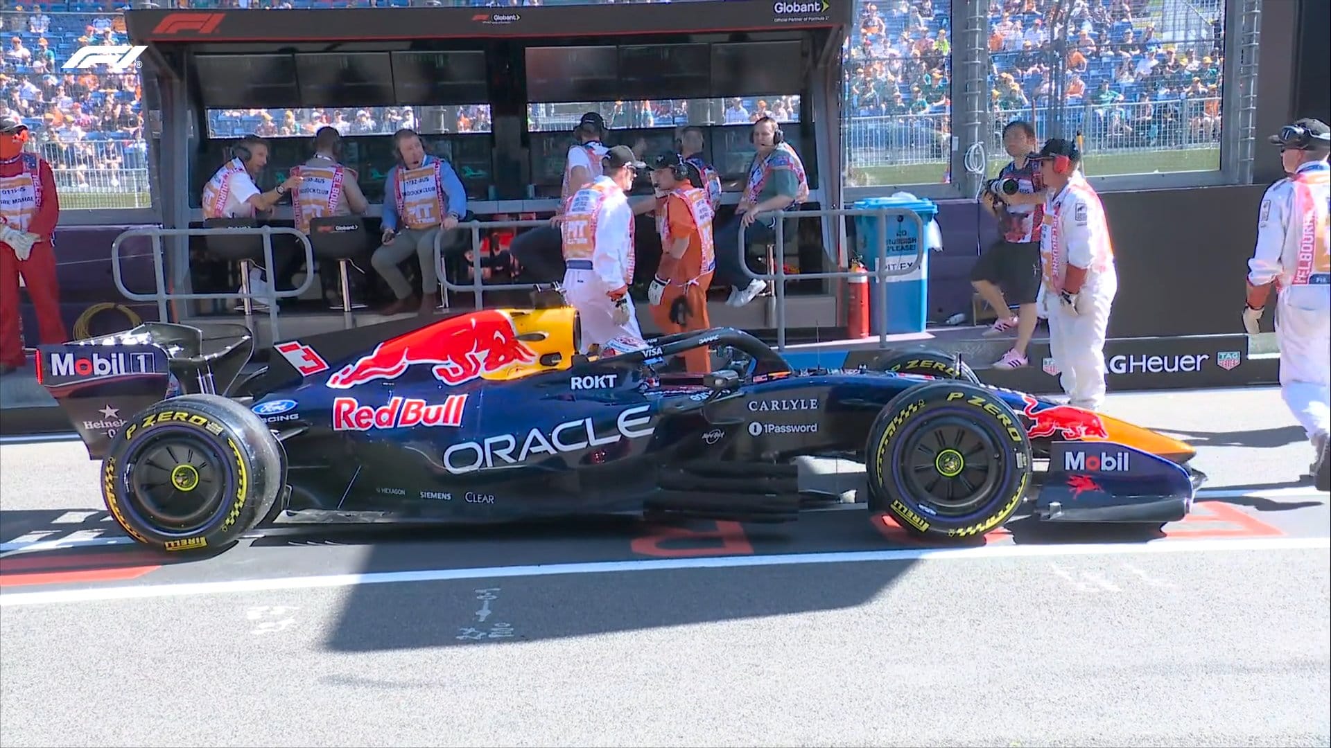 - El Red Bull de Max se queda parado al final del Pit Lane y es empujado de vuelta al garage